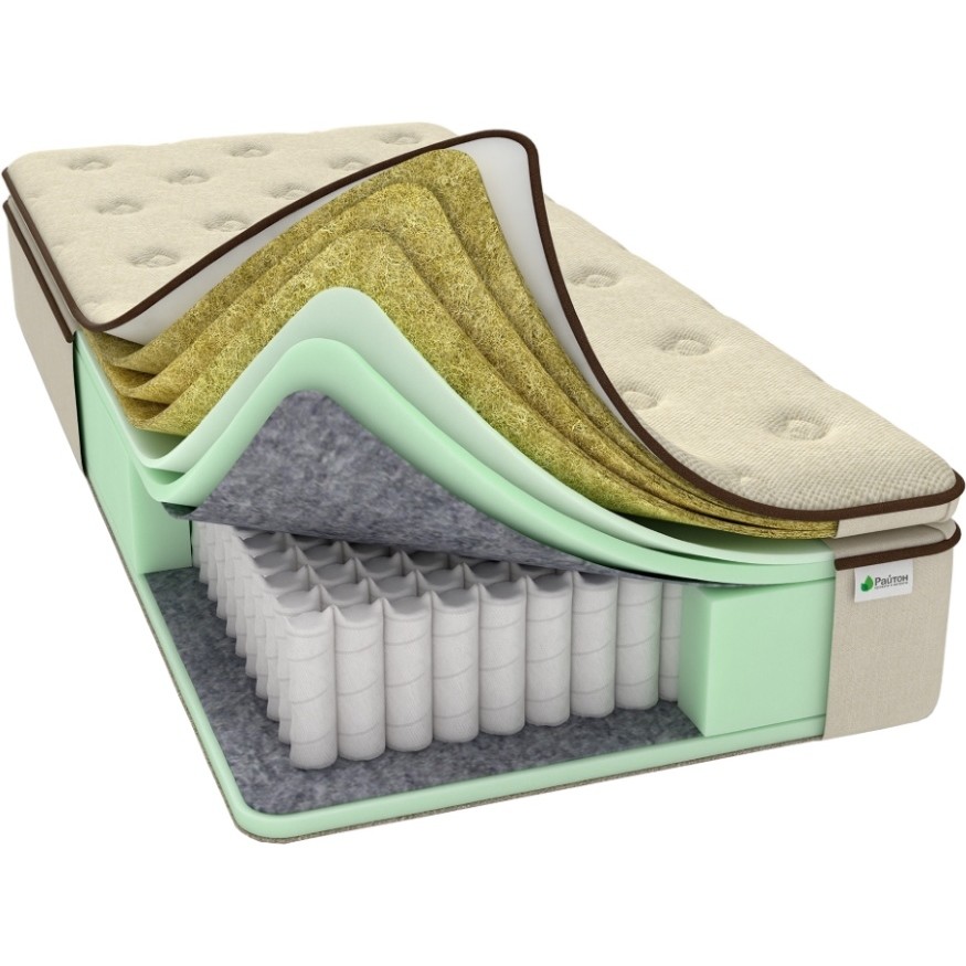 Матрас от компании Raiton, модель OrtoBio F 200x200, Тип пружинный (независимый), Жесткость высокая (5) и Количество слоев 9 шт, а также Наполнитель сизаль, пенополиуретан, термовойлок.