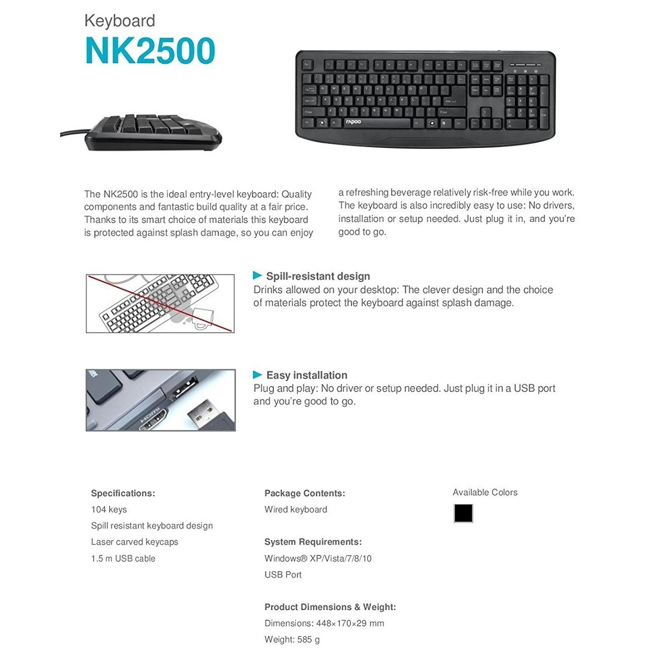 Клавиатура от компании Rapoo, модель NK2500, Тип подключения проводная, Формат стандартная (KS), с Num-блоком и Ход клавиш высокий, а также Тип клавиш классического типа.