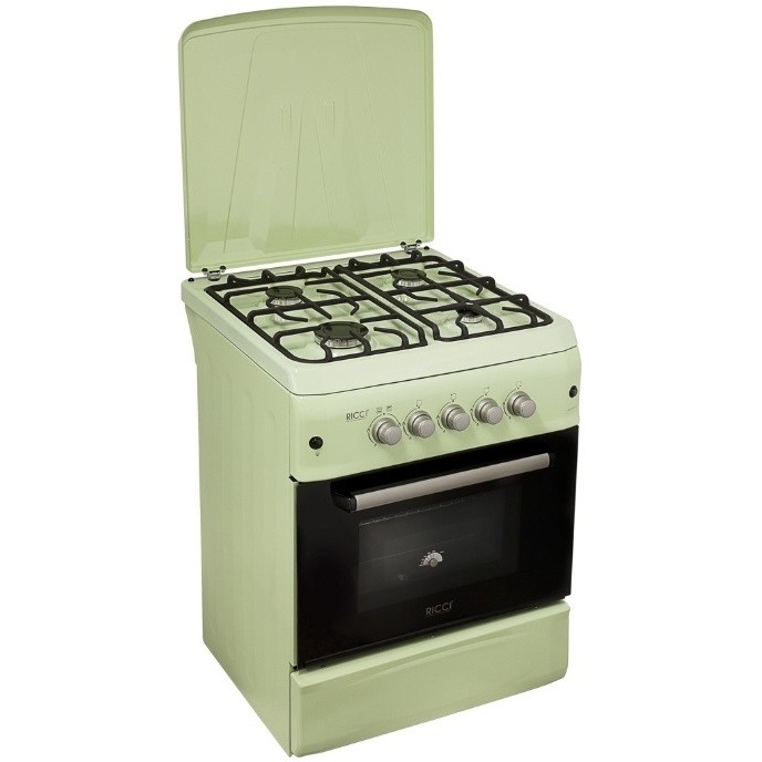 Плита от компании RICCI, модель RGC 6050, Тип варочной поверхности газовая, Управление конфорками поворотные переключатели и Тип духовки газовая, а также Объем духовки 63 л.