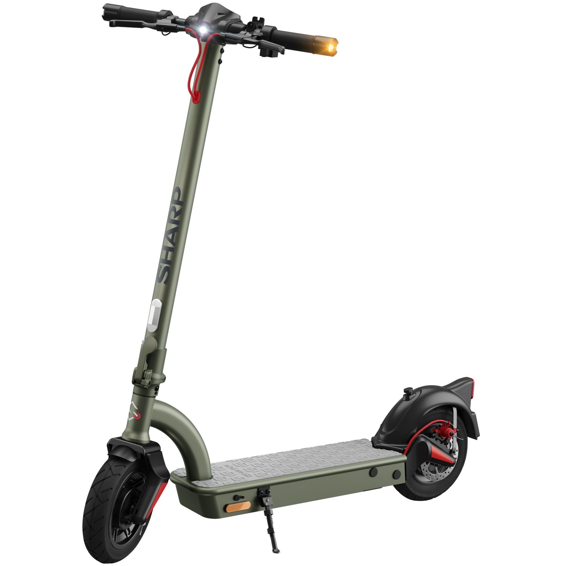Электросамокаты от компании Sharp, модель EM-KT4AEU-G, Максимальная нагрузка 120 кг, Запас хода 35 км и Мощность двигателя 350 Вт, а также Максимальная скорость 25 км/ч.
