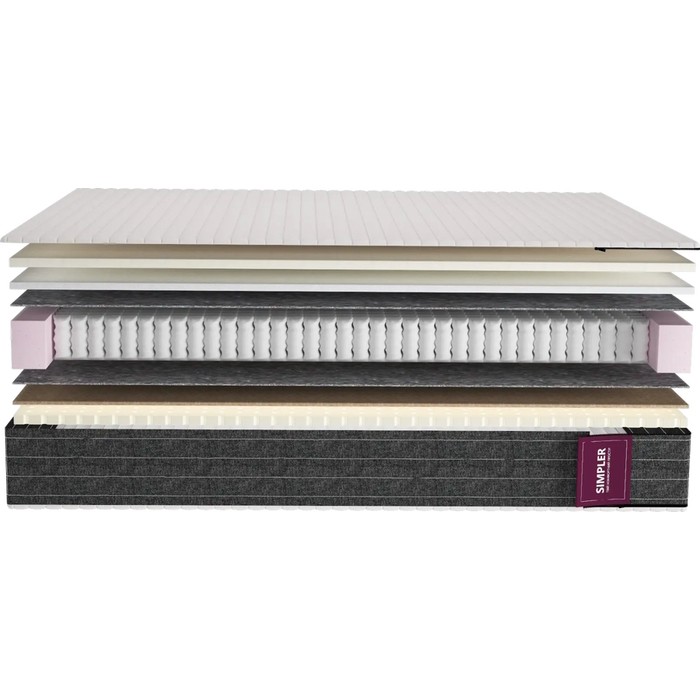 Матрасы от компании Simpler, модель Flexy Space 90x190, Тип пружинный (независимый), Жесткость средняя / выше средней (двусторонний) и Количество слоев 7 шт, а также Наполнитель пена (Memory Foam), пенополиуретан, войлок, кокосовая койра, латекс.