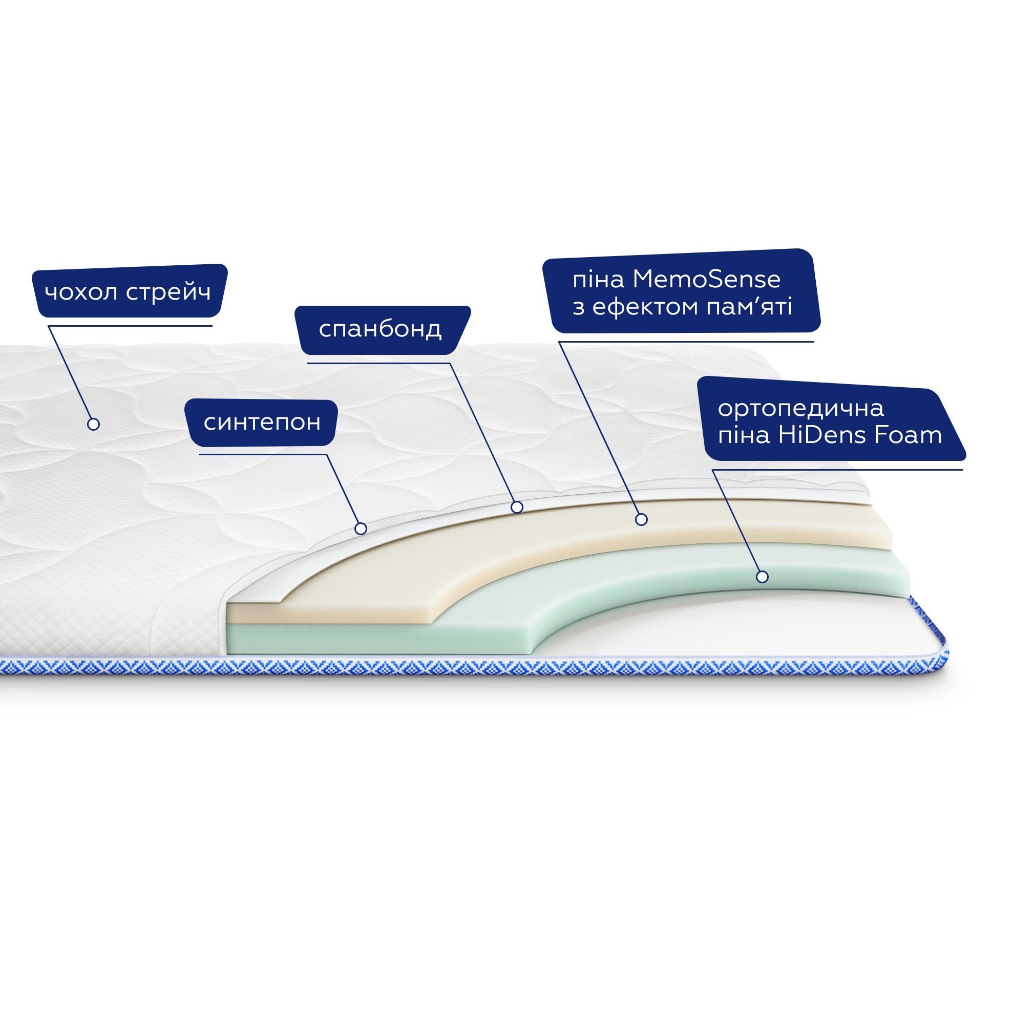 Матрасы от компании Sleeper, модель UP Memo 90x200, Тип беспружинный, Жесткость ниже средней / средняя (2/3), двусторонний и Количество слоев 4 шт, а также Наполнитель спанбонд, пена (Memory Foam), пенополиуретан.