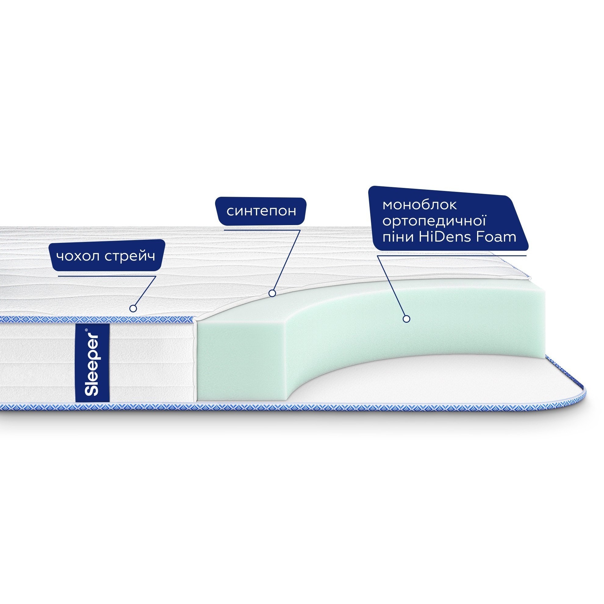 Матрасы от компании Sleeper, модель Zoom 150x190, Тип беспружинный, Жесткость выше средней (4) и Количество слоев 1 шт, а также Наполнитель пенополиуретан.