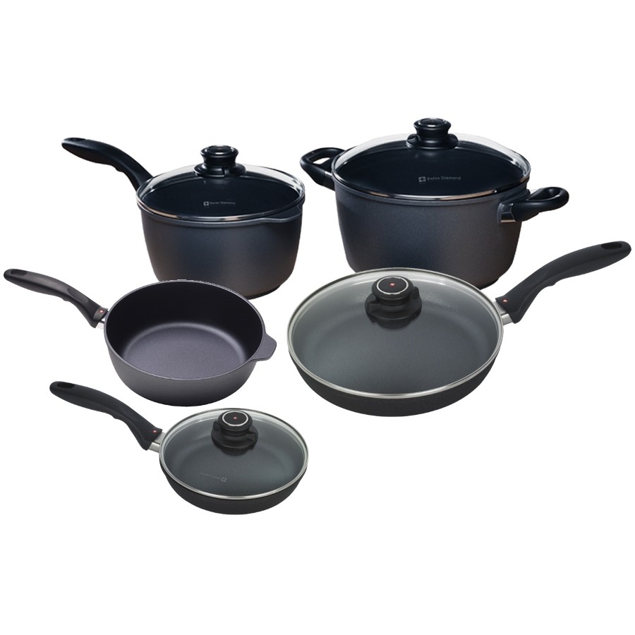 Кастрюля от компании Swiss Diamond, модель SET609, Тип набор посуды, Основных предметов 5 шт и Размер 18 см20 см24 см24 см28 см, а также Материал алюминий.
