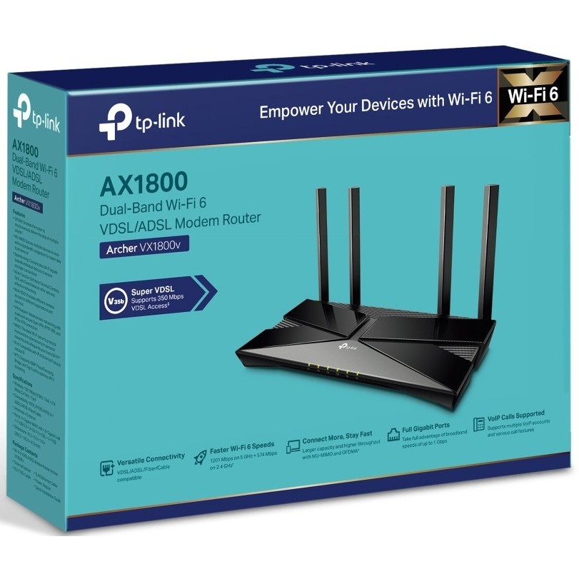 Wi-Fi оборудование от компании TP-LINK, модель Archer VX1800v, Тип устройства DSL модем/роутер, Вход данных (WAN-port) Ethernet (RJ45) / DSL / 3G модем (USB) / 4G (LTE) модем (USB) и Стандарты Wi-Fi Wi-Fi 3 (802.11g) / Wi-Fi 4 (802.11n) / Wi-Fi 5 (802.11ac) / Wi-Fi 6 (802.11ax), а также Частотный диапазон 2.4 ГГц / 5 ГГц.