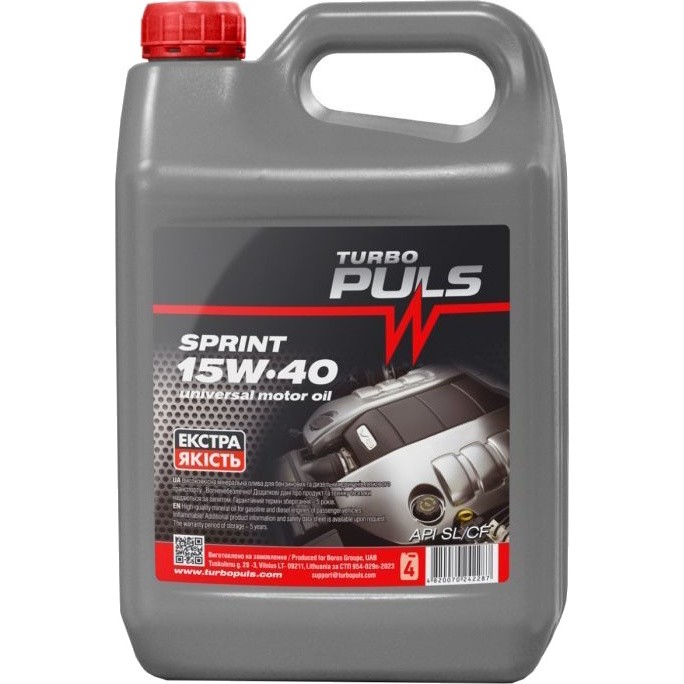 Моторные масла от компании Turbo Puls, модель Sprint 15W-40 4L, Тип минеральное, Двигатель бензиновый / дизельный и Объем 4 л, а также SAE 15w-40.