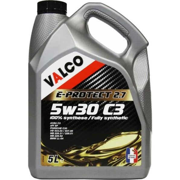 Моторные масла от компании Valco, модель E-Protect 2.7 5W-30 C3 5L, Тип синтетическое, Двигатель бензиновый / дизельный и Объем 5 л, а также SAE 5w-30.